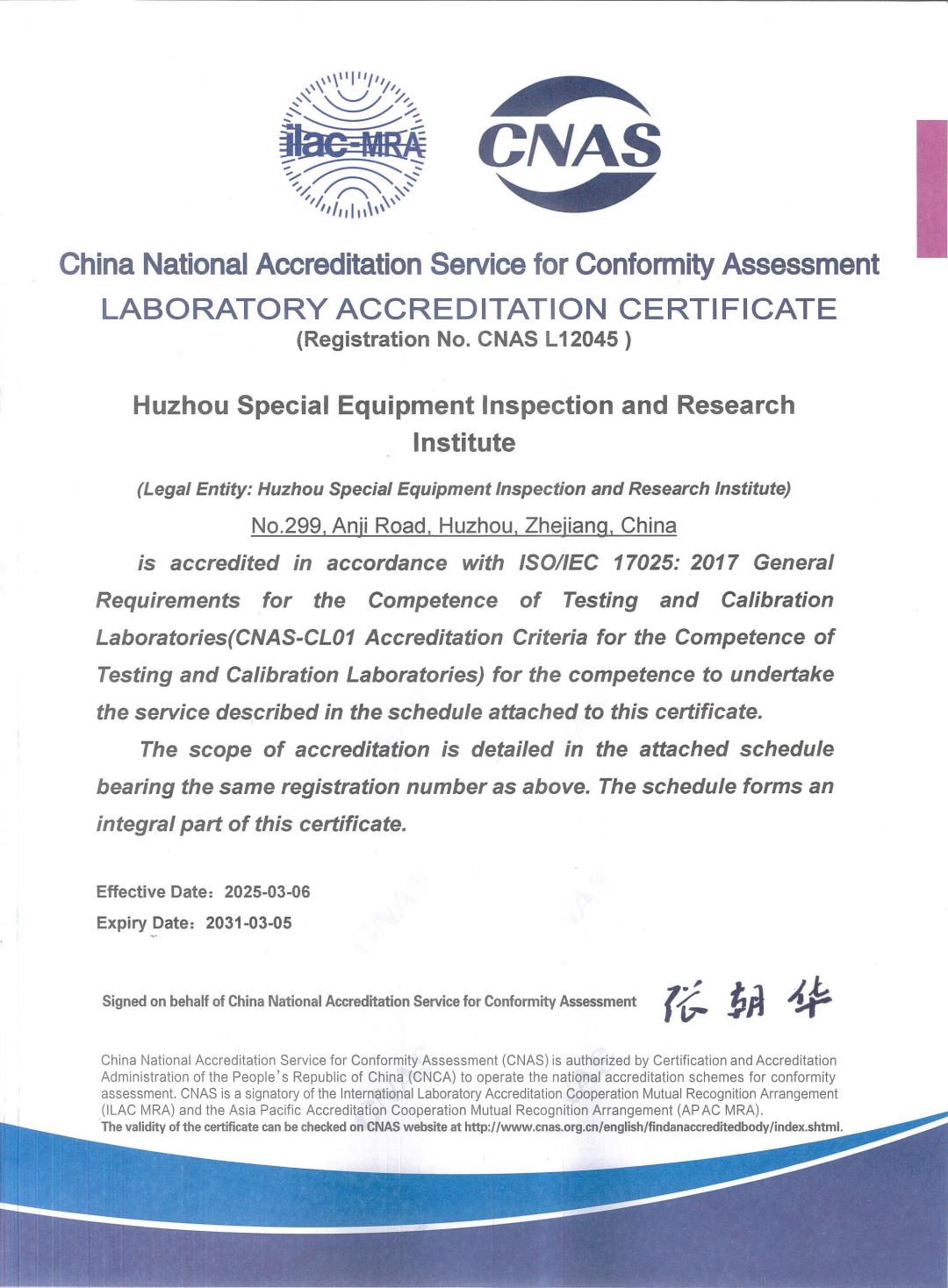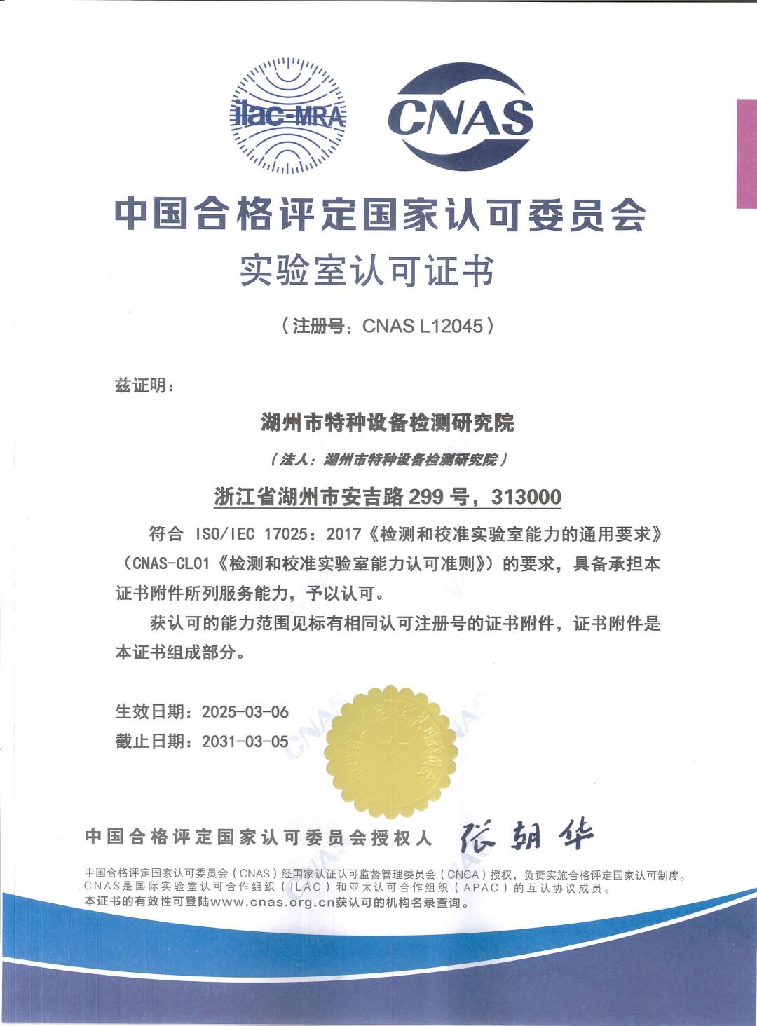 实验室CNAS认可证书