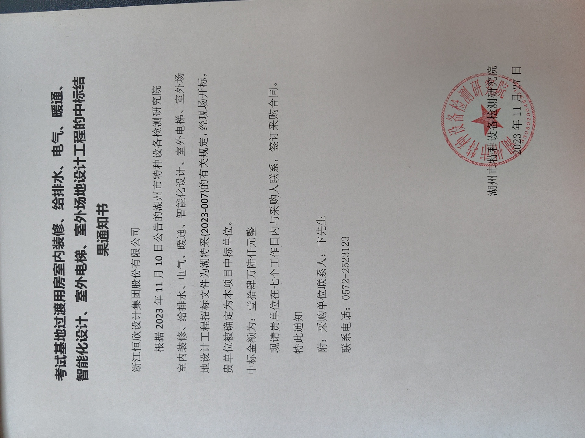 考试基地前台装修工程的中标结果通知书