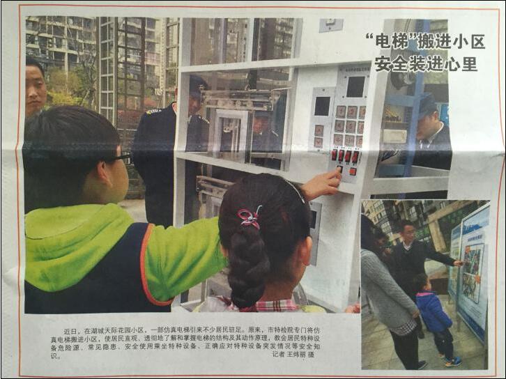 近日,在湖城天际花园小区,一部仿真电梯引来不少居民驻足。原来,7998东方彩专门将仿真电梯搬进小区,使居民直观、透彻地了解和掌握电梯的结构及其动作原理,教会居民特种设备危险源、常见隐患、安全使用乘坐特种设备、正确应对特种设备突发情况等安全知识。
